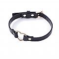 Coleira bondage ajustável por meio de fivelas metálicas, confeccionada em couro sintético.